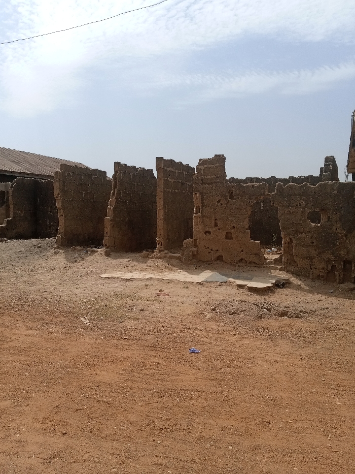 The scene depicts a static outdoor area in Unknown, Unknown, under a light blue sky with sparse, wispy clouds. The foreground consists of dry, reddish-brown earth, sparsely covered with small gravel and debris. A crumpled blue plastic item rests on the ground in the lower-middle section. In the midground, multiple dilapidated structures are visible, characterized by freestanding sections of crumbling masonry walls, likely constructed from mud bricks or rough concrete blocks. These walls show extensive deterioration, with eroded surfaces, large gaps, and irregular tops, suggesting a state of ruin or demolition. To the far left, a portion of a building with a corrugated metal roof is visible. No individuals are present, and no actions or interactions are occurring.