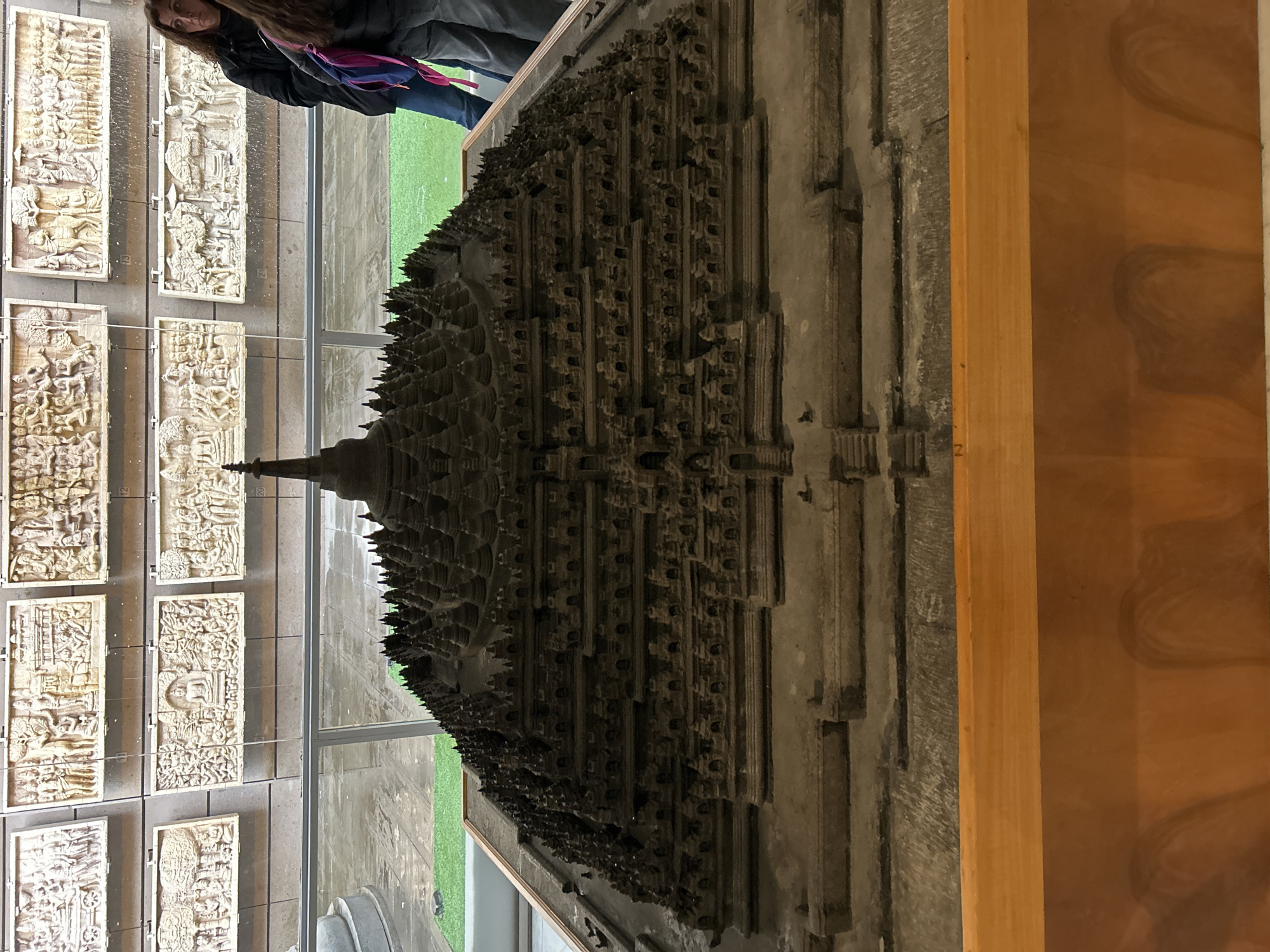 This image depicts an indoor museum exhibit in Città del Vaticano, Vatican City, likely within the Ethnological Museum. The primary subject is a large, dark grey miniature model of the Borobudur temple, a multi-tiered Buddhist monument with numerous small stupas and a central spire, displayed prominently on a light brown wooden plinth in the foreground. Behind the model, separated by a clear glass barrier, a wall displays several rectangular, light-colored carved reliefs depicting scenes with multiple figures and structures, consistent with Buddhist iconography. Faint numbers ("12", "13", "20", "21") are visible on some of these panels. Through the glass, an outdoor or simulated outdoor area is visible, featuring a patch of artificial green grass and a grey paved surface. A portion of a large, rounded, light-colored object is visible on the far left within this background area. On the right side of the frame, two individuals are partially visible. An adult female with dark, wavy hair, wearing a dark jacket and blue jeans, stands facing generally left, observing the exhibit. A second person, mostly obscured, stands closer to the right, showing their back and wearing a grey top with a blue and pink backpack. The scene is lit by ambient indoor lighting.