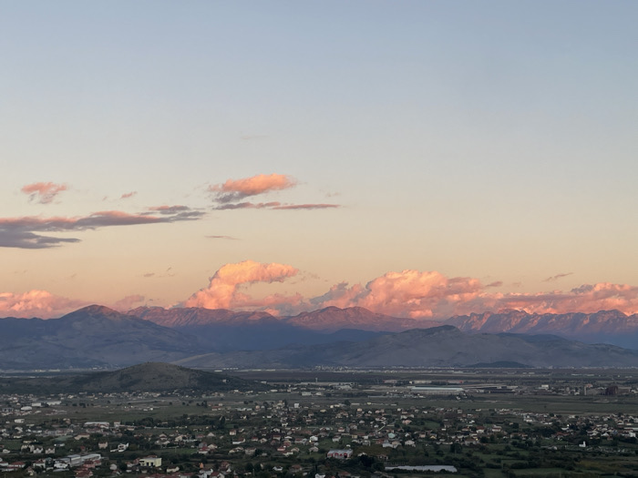 The image presents a panoramic aerial view of Podgorica, Montenegro, observed from an elevated vantage point. The upper sky is clear and light blue, gradually transitioning to warm peach and orange tones near the horizon. Scattered cumulus clouds are illuminated from below with vibrant pink and orange hues, particularly concentrated above the mountain range. A long, dark blue-grey mountain range stretches across the horizon, with some peaks exhibiting a faint reddish glow, notably towards the right side of the frame. Below the mountains, the sprawling cityscape of Podgorica is visible, characterized by numerous residential buildings featuring red-tiled roofs, interspersed with green plots of land and trees. A distinct, dark green, conical hill rises prominently within the mid-ground of the urban area. Further back, flatter agricultural or industrial lands extend towards the base of the mountains. The scene is captured during either sunset or sunrise, indicated by the dramatic warm lighting on the clouds and mountain peaks. No discernible people, specific actions, or interactions are present in this wide landscape view.