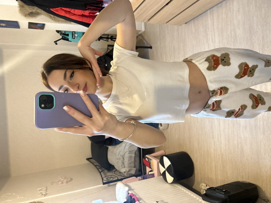 A female subject is captured in a mirror selfie inside a residential room, located in Strasbourg, France. The subject, with dark hair and light makeup, stands centrally, holding a purple-cased smartphone in her right hand at chest level, pointed towards the mirror. Her left hand is posed with fingers spread near her left cheek. She wears a white cropped t-shirt, revealing her midriff, and white pajama bottoms patterned with brown teddy bears. A silver bracelet is on her right wrist, and a silver necklace with a rectangular pendant is visible around her neck. Her fingernails are painted white. The room has light-colored walls and light-toned laminate flooring. To the subject's left, a metal-framed bed with dark bedding, a white vertical radiator, a black and white checkered cylindrical stool, and a small pink two-tiered table with miscellaneous objects are present. A black rectangular device rests on the floor near the radiator. To the subject's right, a light-toned wooden dresser with horizontal drawers is visible. Above the dresser, various hanging clothes, including a red garment and a brown fur-trimmed item, are displayed. A blue tote bag and a black tripod stand are also discernible in the background. The environment indicates a private dwelling, consistent with a bedroom.