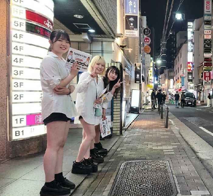 Three East Asian females are positioned on a brick-paved sidewalk at night in the city of Shinjuku, Japan