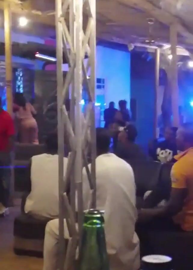 interior of what appears to be a bar or club. Several people are sitting on couches and chairs, while a man in a red shirt moves around them, apparently talking to people. There are other individuals visible in the background, closer to a brightly lit area with blue and green lights. The room has a casual, somewhat rustic decor, with wooden pillars and ceilings. A metal support structure stands prominently in the foreground, partially obscuring the view. Bottles of what appear to be alcoholic beverages are visible on a table in the foreground. The overall atmosphere seems lively.