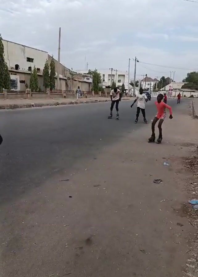 Several young people are roller skating on a paved road. One young man in a white t-shirt with orange and black accents and black pants roller skates toward the camera. He is shouting. In the background, two other young people are roller skating, and a yellow three-wheeled vehicle is parked on the side of the road. The road is lined with buildings, trees, and street lights. The sky is overcast.