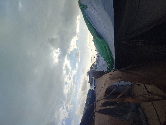 The scene depicts a densely packed informal settlement in the city of Unknown, Unknown, under a partially overcast sky with visible sunlight breaks. In the immediate foreground, two provisional structures are prominent: a light brown, weathered fabric tent on the left, and a darker fabric tent on the right, featuring a bright green tarp draped over its roof. Ropes or lines are strung between these structures. The ground is dry, appearing to be sand or dirt. Numerous similar makeshift dwellings extend into the midground. A distinct multi-story building with a flat roof is visible on the distant horizon, suggesting a more permanent urban presence beyond the settlement. No individuals are present or engaged in activity within the captured frame.