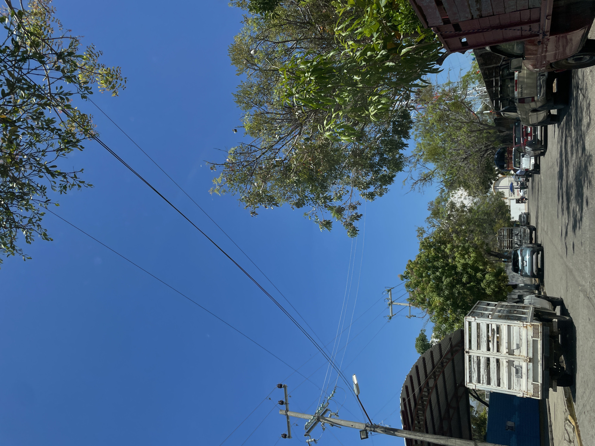 The image is taken from a low angle, looking upwards towards a clear blue sky in what appears to be a street scene. Power lines stretch across the sky. Trees are visible on either side of the street, some bearing what look like hanging fruits. A row of vehicles, predominantly pickup trucks, are parked along the right side of the street. A metal corrugated roof covers a structure adjacent to a blue building on the lower right. The location is suggested to be Puerto Escondido, Mexico. The scene lacks human presence.