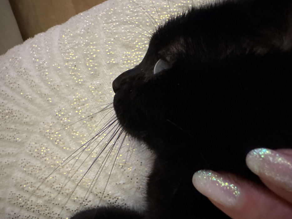 A close-up captures a black cat in profile, resting on a textured, white fabric with subtle gold accents. The cat's face is mostly obscured by darkness, save for its nose, whiskers, and a visible eye. A few fingers with iridescent glitter nail polish gently touch the cat's fur. The image highlights the contrast between the sleek black fur and the shimmering fabric, and evokes a sense of calm and affection.