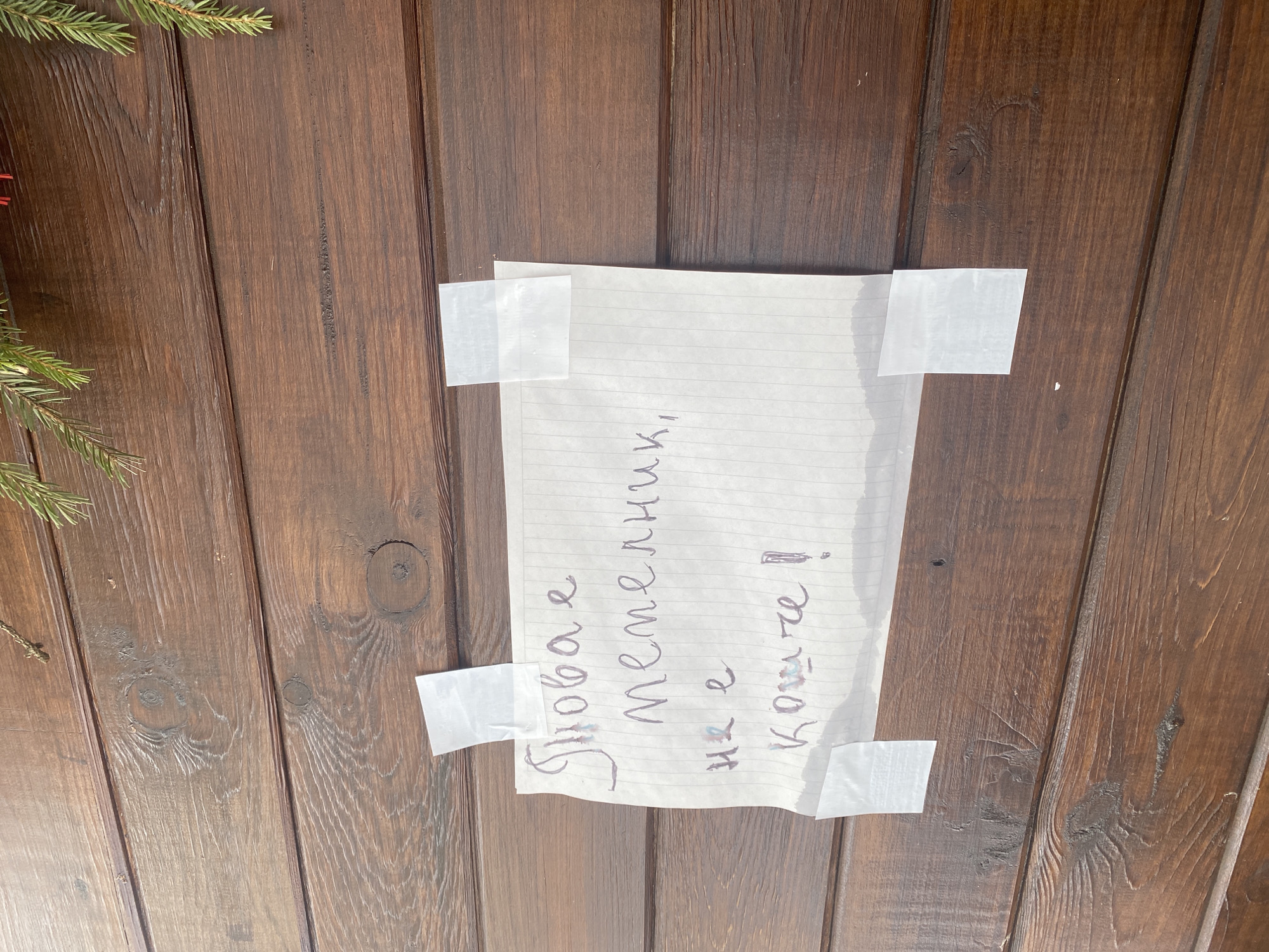 A handwritten note on lined paper is affixed with four pieces of white adhesive tape to a dark brown wooden plank wall. The paper displays text in Bulgarian Cyrillic, handwritten in dark ink, which reads: "Това е Метелник, не е Котче !" (This is Metelnik, it is not a cat!). The paper shows slight wear and some ink bleeding. The wooden planks feature visible grain patterns and circular knots. Green coniferous foliage, resembling pine or fir branches, is partially visible along the top and upper-right edges of the frame. This scene is located in the city of Smolyan, Bulgaria.