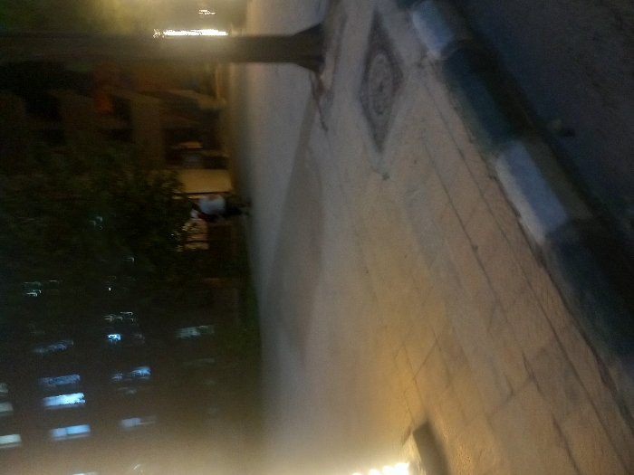 The image depicts an urban street scene at night in Al-Mazza Municipality, Syria. In the foreground, a tiled sidewalk runs from the lower left to the mid-right, bordered by a curb painted in alternating dark and white segments. A square metal utility cover with an embossed circular design is visible on the sidewalk. A bright, rectangular, low-level artificial light source is partially visible on the far left. The midground features a wider paved area or path. Two individuals are walking away from the camera in this area; one wears a lighter-colored top, and the other wears darker clothing. Their specific features and actions are indistinct due to motion blur and low light. Several dark-leafed trees are present, partially obscuring the background. A prominent tree trunk stands on the right side. In the background, a multi-story building on the left exhibits several rectangular windows with internal, bluish-white illumination. Another darker building or structure is partially visible further right. The scene is dimly lit by artificial sources, and the overall image quality is blurry due to low light and possible motion.