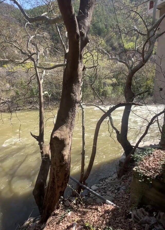 The scene is a somewhat overcast day at the edge of a fast-flowing, turbid river, viewed from slightly above. The water is a muddy brown color. Several bare-branched trees stand between the camera and the river, slightly obscuring the view. The ground is covered with brown leaves and some small rocks. To the right of the frame is the corner of a light-colored building with visible electrical wiring. In the background, a forested hillside rises. The camera slowly pans slightly to the right.