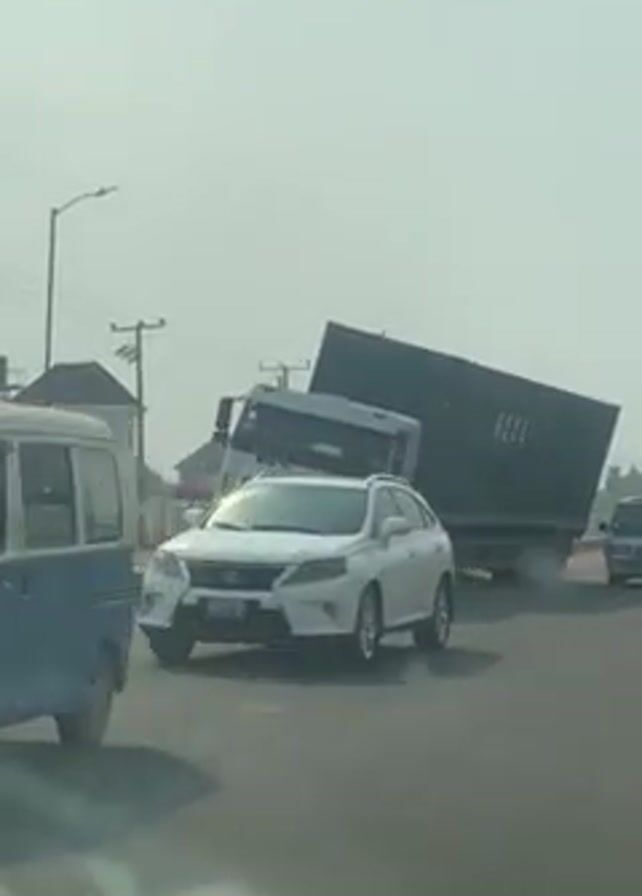 large truck overturned on the side of a road. The truck is silver and has a large black container. A small blue and white van is in front of the truck. A white SUV is also visible on the side of the road near the truck. The video is taken from inside a car that is driving down the road. The windshield of the car is cracked. The weather is hazy. There are light poles and a small building visible in the background.