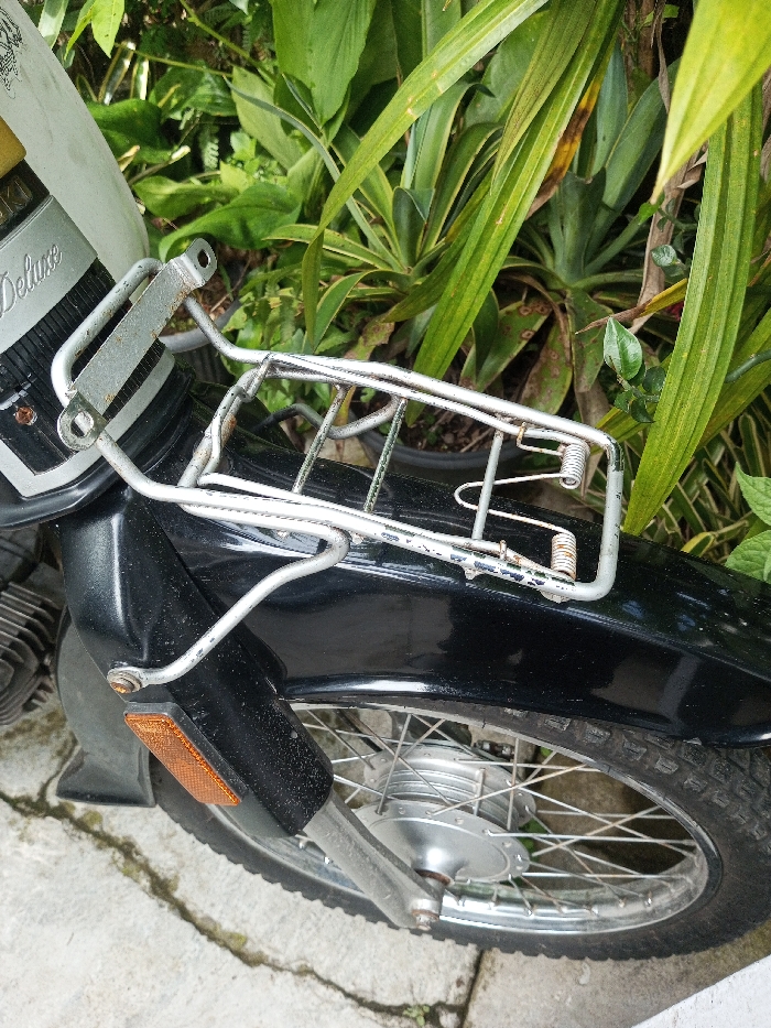 The image depicts a close-up, outdoor view of the front section of a motorcycle, stationary on a concrete surface in Salai Har Htan, Myanmar. The motorcycle's front is primarily black, with a lighter upper panel displaying "Deluxe" and partially visible "ZUKI" branding. A silver metal front rack, exhibiting wear and minor corrosion, is mounted above the black front fender and features two coiled springs on its right side. An orange rectangular reflector is affixed to the lower left fender. The front wheel, partially visible at the bottom, features a silver rim, spokes, and a tire with a distinct tread pattern. Metallic components of the front suspension and engine casing are visible on the left. The background is composed of dense, lush green foliage with various plant types, some showing signs of discoloration, and a partially visible black plant pot.