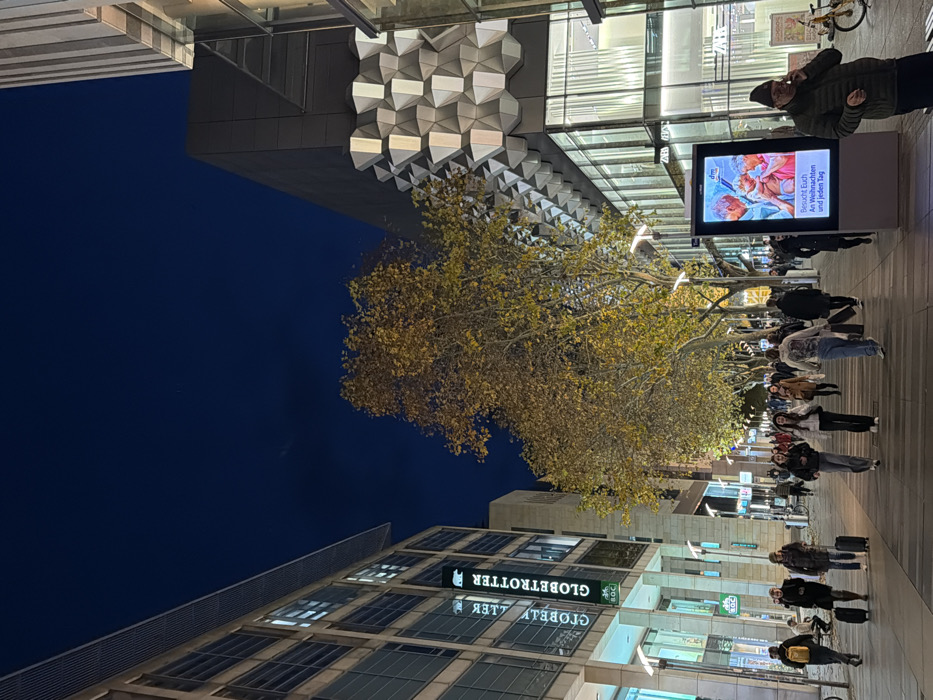 The image depicts a nighttime scene on Prager Straße, a pedestrian shopping street in Dresden, Germany. The sky is dark blue, indicating a clear evening. To the left, a multi-story modern building houses commercial establishments, prominently displaying a vertical illuminated sign for "GLOBETROTTER" with a bear logo and "BOC" beneath it. Storefronts along this building are brightly lit, illuminating sections of the pavement. To the right, another multi-story modern building, identified as part of the Altmarkt-Galerie, features a distinctive upper facade composed of repeating, light-colored, multi-faceted geometric shapes. The lower levels have large glass display windows, with "ZARA" branding visible on one of the storefronts. A row of deciduous trees with bright yellow and orange autumn foliage lines the center of the pedestrian walkway, illuminated by artificial lighting from below and the sides. Modern streetlights with white, upward-curving fixtures are spaced along the street. The pedestrian walkway is paved with alternating light and dark gray rectangular panels. Approximately 20-30 individuals are present, mostly adults, walking in various directions along the street. They are dressed in coats and jackets, consistent with cool weather. Two individuals on the left are observed pulling wheeled luggage. One person is seated on a light-colored bench on the far left. On the right side of the walkway, near the Altmarkt-Galerie, a large vertical digital advertising screen displays a "dm" advertisement featuring people and the German text "Besucht Euch An Weihnachten und jeden Tag" (Visit each other at Christmas and every day). Adjacent to this screen, a man in a dark green puffer jacket and dark beanie stands, holding a mobile phone to his right ear, engaged in a conversation. A yellow bicycle with a front basket is parked nearby.