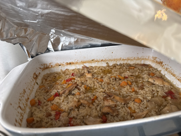 - "The image displays a close-up, elevated view of a rectangular white ceramic baking dish filled with a cooked meal" by FM-nHpMF2, licensed under CC BY 4.0