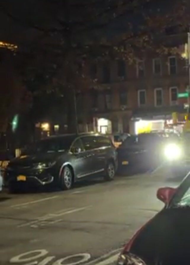 At night, on a street lined with parked cars, a large yellow semi-truck with a white trailer passes by. The camera focuses on the truck, capturing its headlights, grill, and the side of its trailer as it moves along the street. A red car, only partially visible, is parked in the foreground. In the background, a building with a deli or market at street level can be seen. Street signs and trees also contribute to the urban environment.