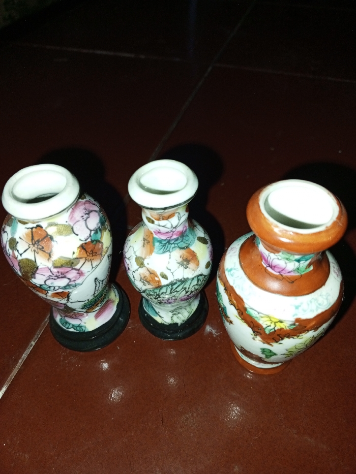 - "This image depicts three small, ornamental porcelain vases positioned on a dark brown, possibly tiled, surface in Longmiang, Laos" by FM-zVPRH2, licensed under CC BY 4.0