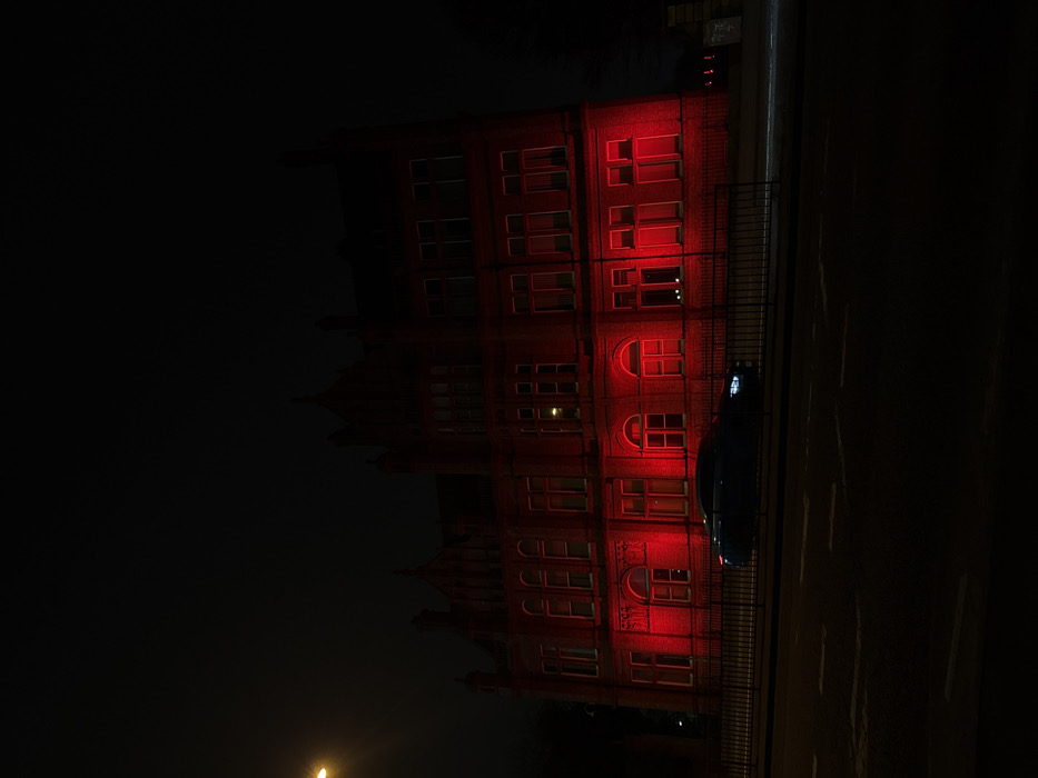 - "The image depicts a nighttime scene in Salford, United Kingdom, featuring a large, multi-story red-brick building illuminated in a vivid red light across its lower and mid-level facades" by FM-CEkUG3, licensed under CC BY 4.0