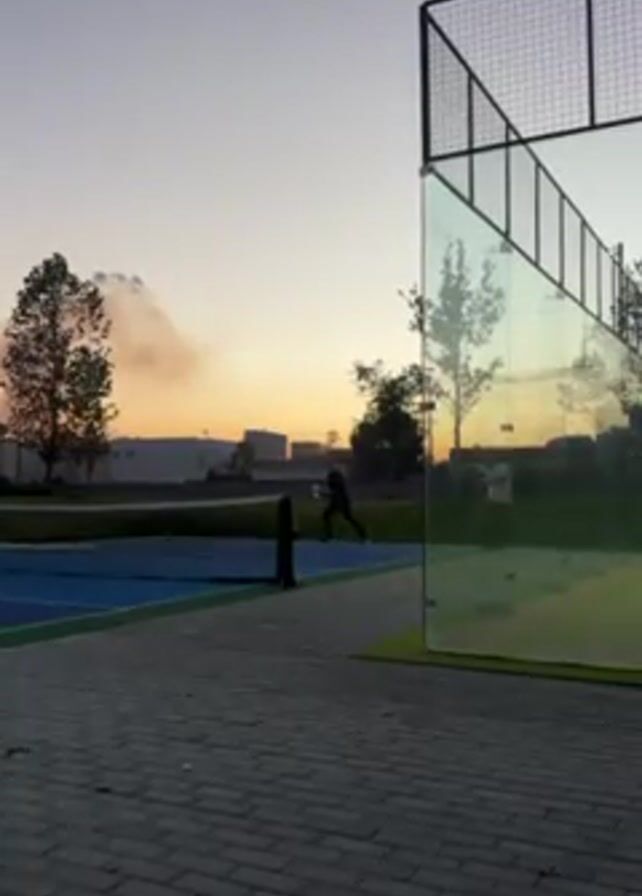 silhouette of a person playing padel or tennis on an outdoor court at dusk