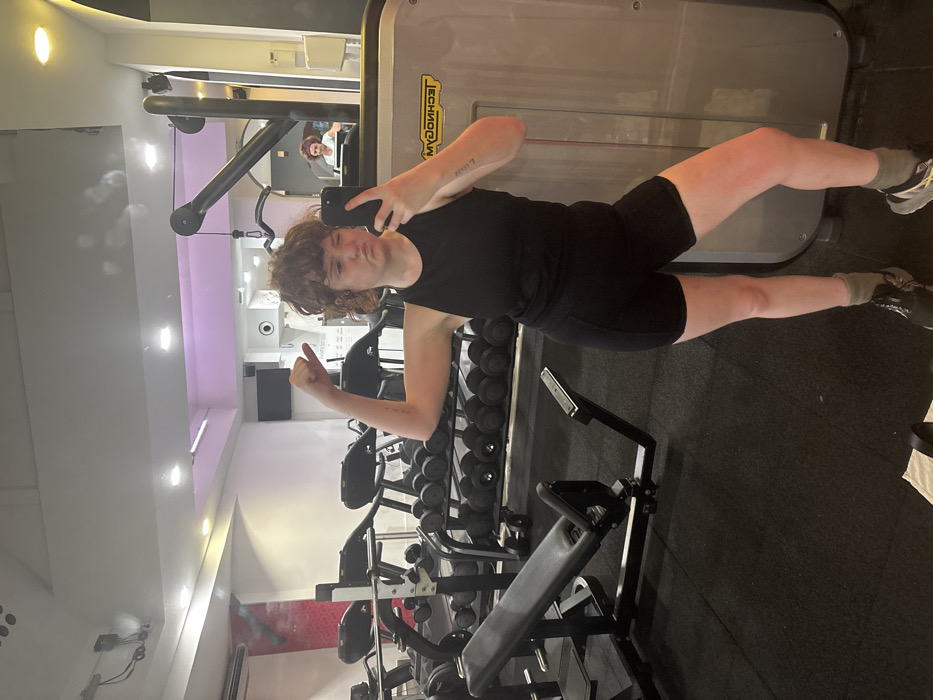 A person in a black tank top and shorts poses in a gym. They hold a phone in their right hand, taking a selfie, and give a thumbs-up with their left hand. In the background are rows of dumbbells, gym equipment, and a mirror reflecting the gym setting. The person is facing towards the camera, with the gym equipment positioned behind them.