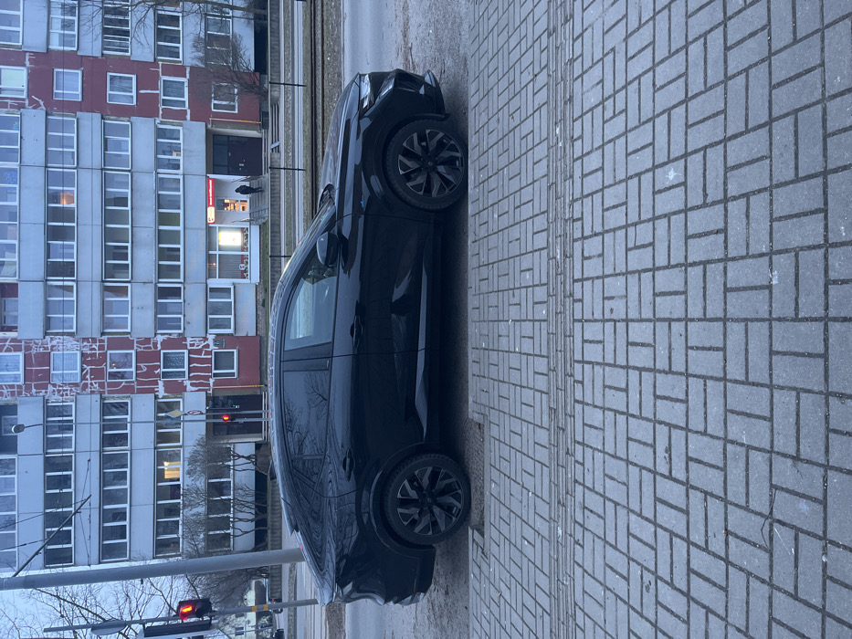 The scene depicts a street view in Liepaja, Latvia, under dim, likely overcast conditions. In the immediate foreground, a grey patterned sidewalk extends horizontally. A tactile paving strip for pedestrian guidance is present on the sidewalk. A dark-colored, modern SUV or crossover vehicle, possibly a Nissan Ariya, is parked parallel to the curb on the adjacent street, facing left. The vehicle features dark tinted windows, dark multi-spoke alloy wheels, and a blue-colored emblem on its front quarter panel. Beyond the vehicle, a paved street contains two sets of tram tracks. On the left, a traffic light displays a red signal. In the background, a multi-story building, likely residential or mixed-use, dominates the frame. Its facade is a combination of light grey sections and weathered red sections with visible cracking and peeling paint. The ground floor of this building features at least one illuminated commercial establishment. A single individual, dressed in dark clothing, is standing near the entrance of this establishment, facing away from the camera. Sparse, bare-branched trees are visible between the street and the building.
