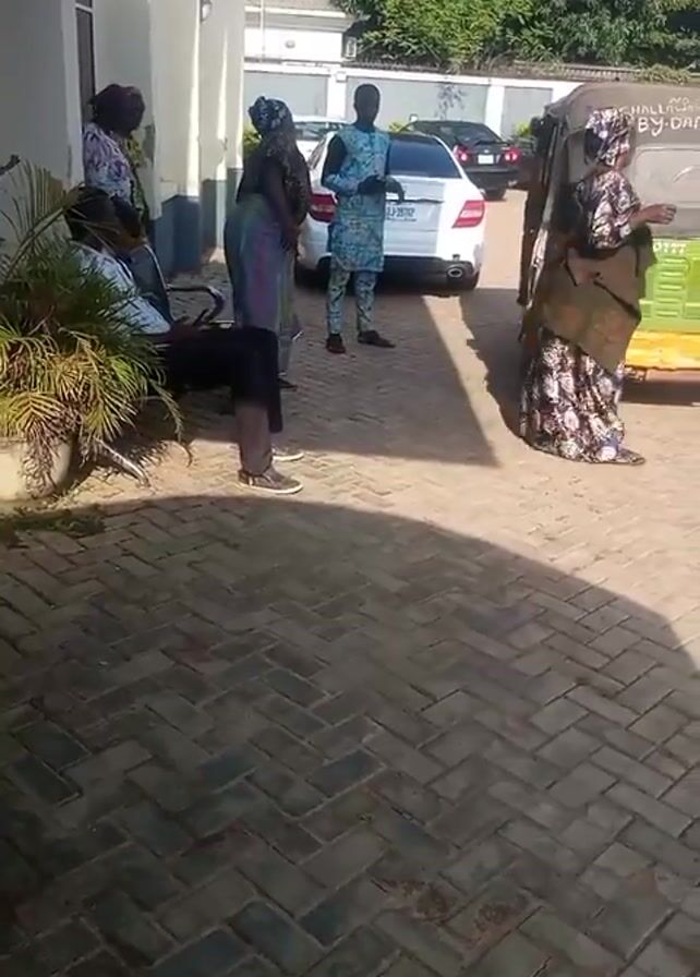 n outdoor scene with a brick paved area. A man is seated on a bench on the left side of the frame, with several women standing nearby. Another man stands further back, closer to a white car. To the right of the frame, there is a yellow and green three-wheeled vehicle. A building is visible in the background, and some trees are present. The people are wearing diverse clothing. The scene is well-lit with shadows cast by the sun.