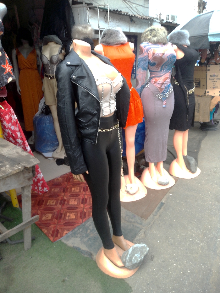 The scene depicts a street-side clothing display in a market stall, consistent with an urban environment in Ikeja, Nigeria. Five headless mannequins, arranged in a diagonal line from foreground-left to background-right, exhibit various garments. Each mannequin stands on a peach-colored, circular plastic base, with large grey or white rocks placed on their feet for stabilization. The foremost mannequin wears a black faux leather jacket, a light-colored corset-style top with vertical seams, black leggings, and a gold-colored chain belt. Behind it, a mannequin displays a short beige dress with a belt; its head is obscured by a grey, fur-like accessory. The next mannequin showcases a bright orange sleeveless dress, its head also covered with a grey, fur-like item. A fourth mannequin wears a long-sleeved, patterned top with blue, brown, and white hues, a grey long skirt, and a silver-colored chain belt with a prominent buckle; its head is similarly obscured by a grey fur-like accessory. The final visible mannequin on the far right is dressed in a black short dress with a gold-colored chain belt, and its head is covered by a grey, fur-like accessory. Additional mannequins are partially visible further back within the dimly lit stall, including one in a long orange dress. The immediate foreground features a rustic wooden table on the left. The ground transitions from a patch of green artificial turf on the far left to a reddish-brown tiled section, and then to grey asphalt or concrete where the mannequins' bases rest. In the background, under a corrugated metal roof, various items of clothing are hung. A white cardboard box labeled "Mobil Super 1000" and a partially visible grey umbrella are situated on the far right.