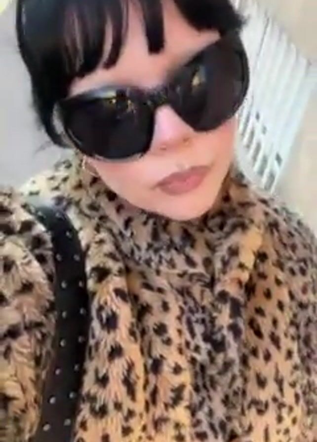 A woman with dark hair and bangs, wearing large sunglasses and a leopard-print coat, walks in an outdoor setting