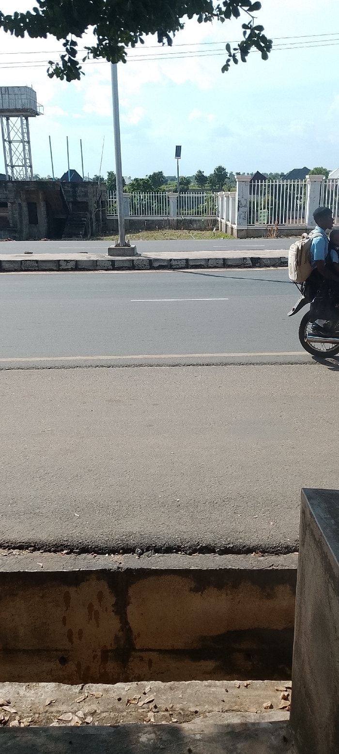 The scene depicts an outdoor street in Adankolo, Nigeria, under daylight conditions with a clear sky and scattered clouds. A paved asphalt road, marked with a white dashed line, occupies the midground. To the left of the road, a concrete curb separates it from a raised concrete median where a tall, light-colored utility pole is anchored. In the background on the far left, a metal water tower is visible, with a dark, multi-level concrete structure beneath it. To the right of the utility pole, a white metal fence with concrete pillars marks a property boundary, behind which green trees and foliage are present. A pole-mounted solar-powered streetlight is also visible beyond the fence. On the asphalt road, a dark-colored motorcycle is in motion, traveling from the right side of the frame towards the left. Two individuals are riding the motorcycle. The passenger in the rear is wearing a light blue shirt and a tan-colored backpack. The driver is partially obscured by the passenger and the motorcycle's frame. The bottom foreground features a concrete ledge or barrier, indicating the vantage point. Overhead, dark green tree branches partially obscure the upper portion of the sky.