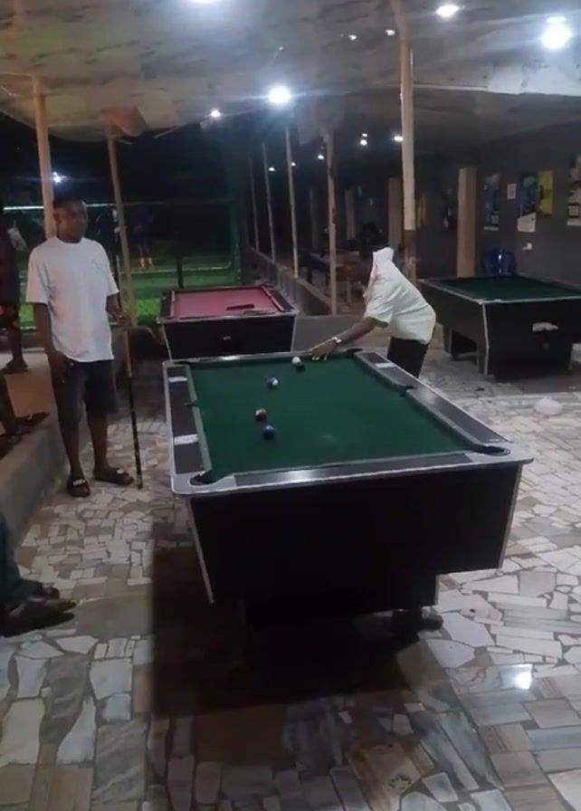 The scene depicts an outdoor pool hall with several individuals engaged in playing pool. Three pool tables are visible, each surrounded by players and spectators. The foreground table is green, while the others are red and green. One man is actively taking a shot. Others stand around observing. The pool hall is covered by a roof supported by pillars. The floor is tiled with a patterned design. Lighting is provided by overhead lamps, creating a bright atmosphere. In the background, a grassy area and more covered spaces are discernible. The overall setting suggests a casual, recreational environment.