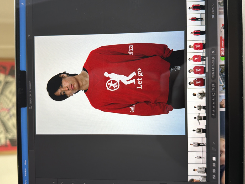 An eye-level photograph captures an open laptop screen displaying image editing software. The laptop features a black bezel and a screen with a visible notch at the top center. Reflections of an indoor environment, including a patterned object with red and black geometric designs and diffuse overhead lighting, are present on the screen surface. The software interface, resembling a professional photo editor, shows a partial menu bar with "View", "Window", and "Help" at the top left, and a search bar displaying "Search CS4 LB DYNAMIC" centrally. The main display area presents a large, portrait-oriented photograph of a young East Asian male against a plain white background. He has shoulder-length dark hair, styled with a center part, and wears a silver necklace and earrings. He is dressed in a red crew-neck sweatshirt. The sweatshirt features a white circular logo on the chest, containing a stylized human figure with outstretched arms, and the white text "Let go" printed below it. Partial white text is visible on the left sleeve ("ael.") and the right sleeve ("el.za"). He stands with his hands in his pockets, and black trousers are visible below the sweatshirt, with a silver chain or keychain attached near his right hip. His expression is neutral as he looks directly forward. Below the main image, a horizontal filmstrip displays numerous thumbnail images. These include multiple shots of the same model wearing the red sweatshirt from various angles, as well as images of the model in a light-colored, possibly striped or patterned, jacket or shirt. Editing controls such as "Paste Edit Settings" and "Fit 100%" are visible in this lower section.