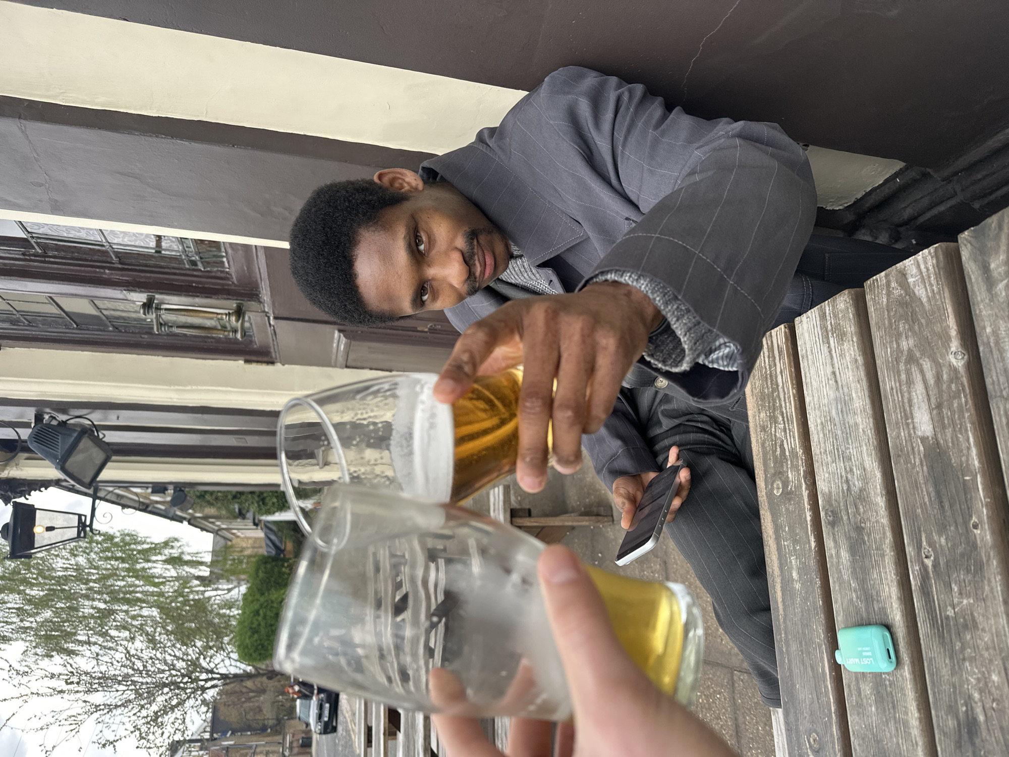 - "A man in a gray pinstripe suit is seated outdoors at a wooden table and bench in what appears to be a pub or bar setting" by FM-hLwGm2, licensed under CC BY 4.0