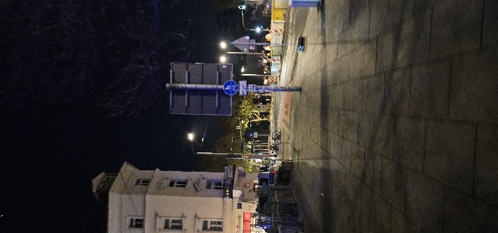 A nighttime street scene reveals a building with lit windows on the left, adjacent to dark trees. Streetlights illuminate a pedestrian walkway of stone, leading past a road with visible traffic signs. Construction barriers are present along the road. A prominent blue pedestrian sign is mounted on a pole. The scene is dimly lit, with varying light intensities highlighting different parts of the street.