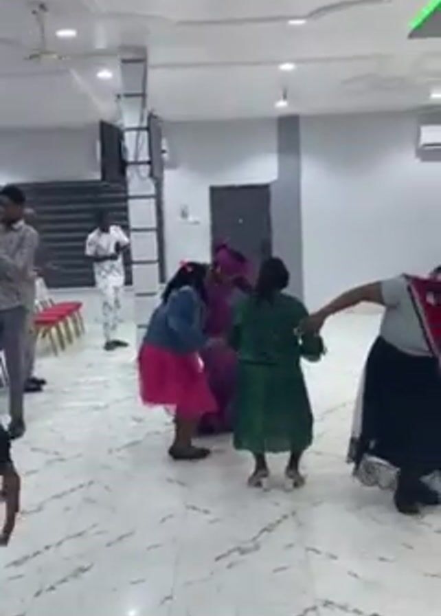 vibrant scene in a large, well-lit hall, possibly a church or community center. Initially, several people are dancing energetically on the tiled floor, moving to the music. As the camera pans, it reveals a choir dressed in black robes with yellow stoles, standing on a slightly raised platform. They are positioned in front of a backdrop featuring a picture with the words "Following Him." A man in a suit is seen standing with them on the platform. There are speakers and floral arrangements on the stage. The hall is decorated with modern lighting fixtures, including recessed lighting and colored lights, adding to the lively atmosphere. Throughout the video, the focus shifts between the dancing individuals and the choir, capturing the energy and communal spirit of the event.