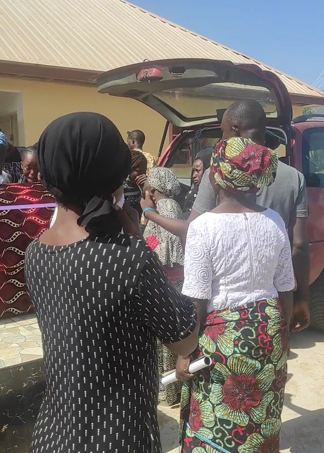 group of people gathered around the open trunk of a red car outside a building with a beige roof. The people are dressed in a variety of clothing, including traditional African patterns and more modern attire. They appear to be focused on something inside the trunk or on the ground near the car. The background includes a clear blue sky and the exterior of the building. The camera is held vertically.