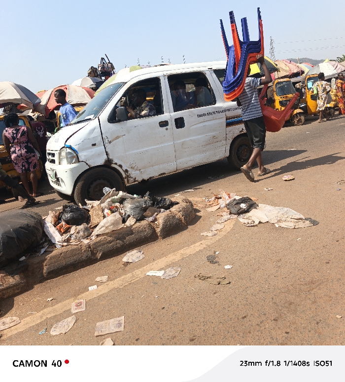 The image displays a busy street scene in Enugu, Nigeria, characterized by significant commercial and transport activity. A two-lane reddish-brown paved road is visible, heavily littered with various debris including paper, plastic, and general refuse. Along the right side of the road, a low concrete curb is almost entirely obscured by a substantial accumulation of garbage, including several black plastic bags filled with waste. In the center-left, a white, visibly dented, and dirty commercial passenger van (likely a mini-bus) is stopped or moving slowly, facing towards the left. The text "ENUGU STATE TRANSPORT COMPANY" is legible on its side. The van exhibits damage to its front bumper and rust along its lower body. At least two individuals are visible inside the vehicle, one in the driver's seat and another behind them. To the left of the van, a woman in a patterned dress and a man in a blue shirt are partially visible, interacting with unseen elements near market stalls. In the foreground, a man wearing a striped shirt and dark shorts is walking on the road, carrying a stack of four plastic chairs (red, blue, orange, blue) balanced on his head, with an additional red chair hooked to the side. Further into the middle ground on the right, several yellow and red motorized tricycles (Keke Napep) are present, suggesting a transport area. The background features numerous market stalls identifiable by various umbrellas and tarps, under a clear, bright blue sky. Faint hills are discernible on the distant horizon.