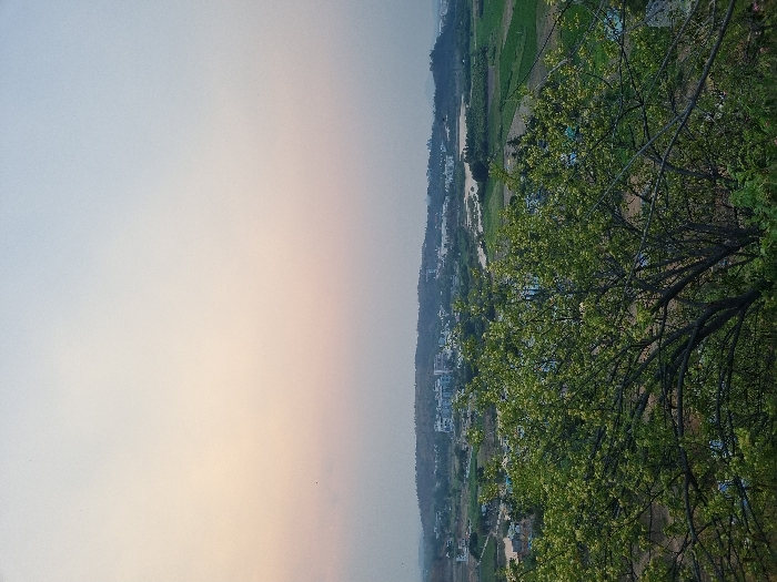 The image displays an elevated panoramic view of the Koyalaguttapalli area in India. The foreground is dominated by the upper canopy of a deciduous tree with numerous light green leaves and dark, visible branches. Beyond this tree, a rural to semi-urban landscape unfolds under a hazy sky, which transitions from pale blue-grey at the top to a soft peach-pink near the horizon, indicative of dawn or dusk. The midground features a combination of extensive green agricultural fields, some appearing waterlogged or muddy, and scattered residential buildings. A winding, brownish-grey river or water body flows across the scene from the left-center towards the right. Adjacent to the river and further left, a cluster of multi-story buildings, indicative of a developed area or town, is visible against the distant terrain. The background consists of a range of rolling hills covered in dense, dark green vegetation. No individuals or specific actions are discernible within the frame.