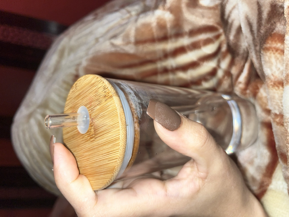 A clear glass tumbler with a bamboo lid and glass straw is held by a hand with painted brown nails