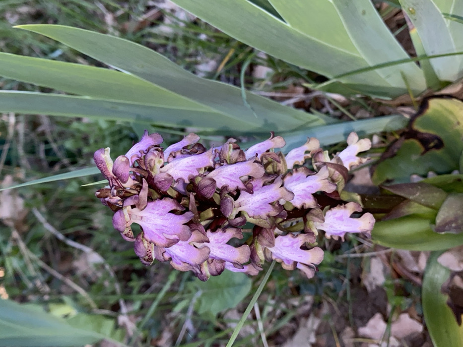 This image depicts a close-up view of a single flowering plant, identified as a wild orchid, within a natural outdoor environment in the city of Apt, France. The central subject is a vertical inflorescence, approximately 15-20 cm in height, composed of numerous individual small flowers densely clustered along a robust central stalk. The individual flowers display a predominant light purple or lilac coloration with darker purplish-brown accents, particularly on the sepals and upper parts of the labellum, which exhibits a complex, somewhat ruffled or scalloped morphology. Some flower margins show a lighter, almost creamy-beige hue. The central stalk is dark green to purplish-brown. To the right of the inflorescence, several large, upright, sword-shaped green leaves, possibly belonging to another plant species like an iris, are visible and slightly out of focus. The background consists of blurred green vegetation, including grass blades and other foliage, along with patches of brown soil and leaf litter, indicating a natural, uncultivated setting. No human figures, animals, or artificial structures are present.
