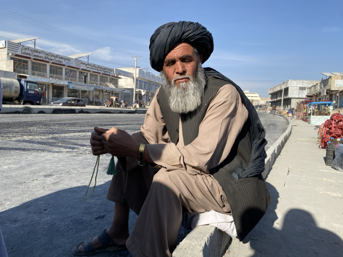 This image captures a daytime street scene in Gundigan Village, گندیگان, Afghanistan. The primary subject is an elderly man, positioned in the foreground, seated on a low concrete curb beside a paved road. He has a prominent white beard, a weathered face, and wears a dark turban, a light brown long-sleeved garment, and a dark, vertically striped vest. His hands are clasped, holding a string of green prayer beads (tasbih) with a green tassel. A gold-colored bracelet is visible on his right wrist, and a dark beaded bracelet on his left. He is wearing open-toed sandals. His gaze is directed slightly downwards and forward. To the left, beyond the man and across a dark-surfaced road, a multi-story building displays a sign in English and local script, identifying it as "Zar Kandahar Private School Kindergarten Islamic Seminary & Modern Studies." This building features numerous windows and appears to have solar panels on its roof. A blue tanker truck is parked on the street, along with other vehicles including a dark car. Utility poles and wires are visible against the clear, light blue sky. To the right of the man, the concrete curb extends, leading down a bustling street. Further in the background, more buildings are visible, some with exposed concrete structures, indicating ongoing construction. Market stalls are present along the right side of the road, displaying merchandise such as large red bags, possibly containing produce like onions or potatoes. Several other individuals are visible in the distance, moving along the street. Strong sunlight casts distinct shadows across the road and the man's immediate surroundings. No direct interactions between the main subject and others are depicted.