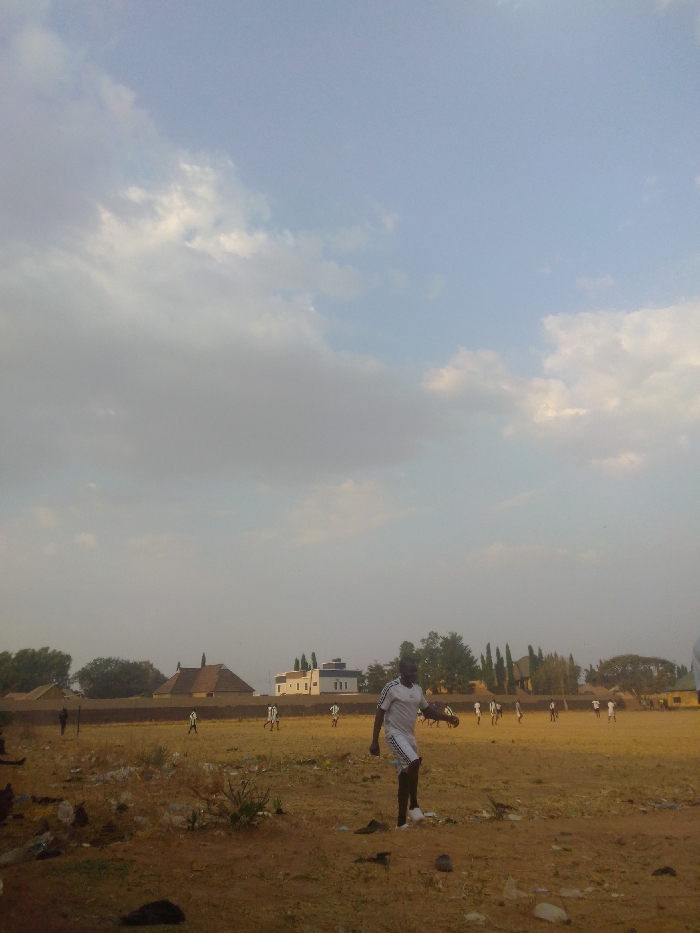 This image depicts an outdoor soccer field scene in the city of Saminaka, Nigeria, under a partly cloudy sky