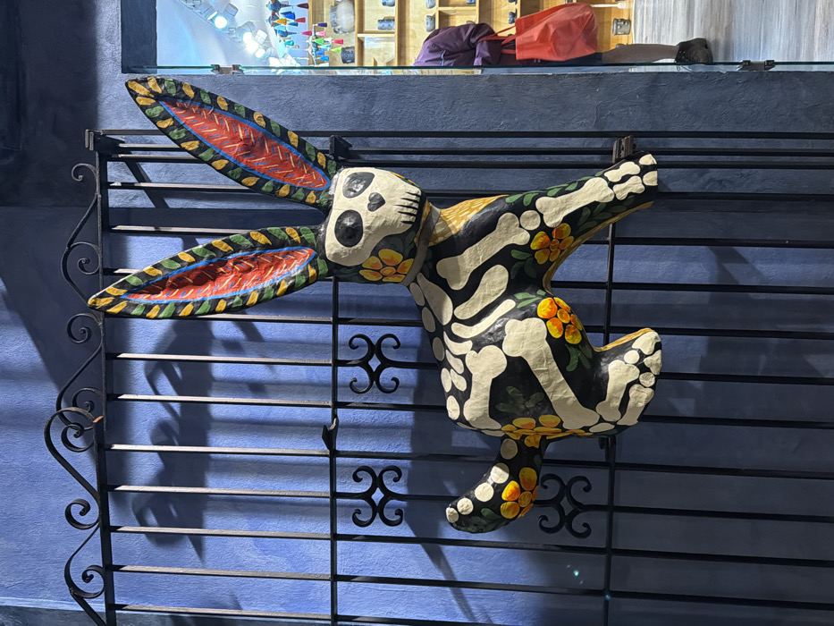 A whimsical, colorful sculpture of a rabbit-skeleton with floral accents is positioned against a wrought-iron gate. The rabbit features elongated, decorated ears, a skull-like face, and a skeleton painted body. Small orange flowers adorn its frame. Above, a dimly lit shelf displays an assortment of items, partially obscured by reflections. The background features a deep blue wall.