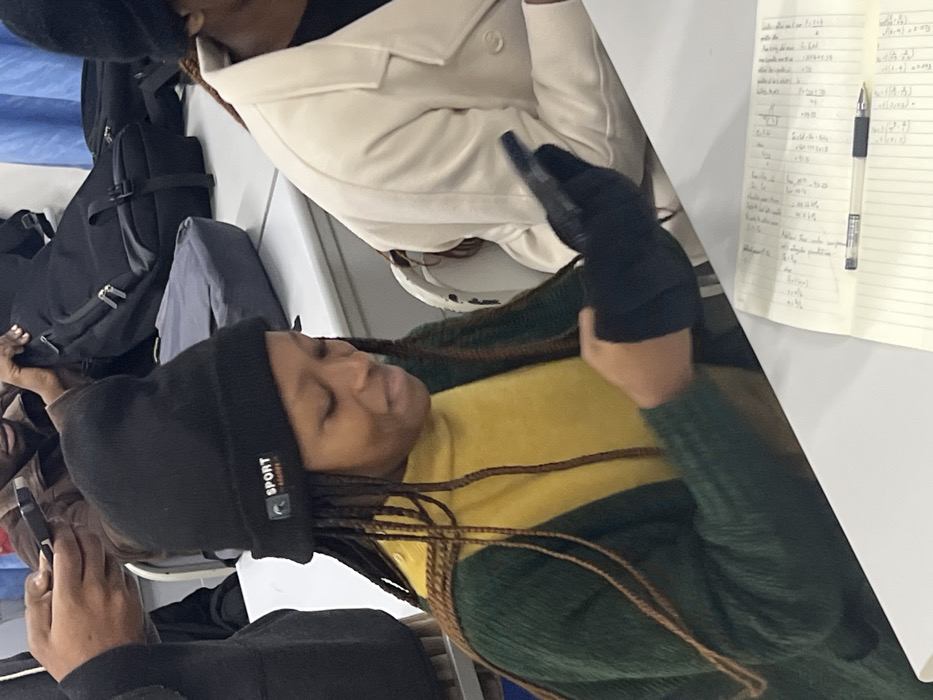 A person wearing a black beanie and a sweater with green and yellow stripes is seated next to a table with an open notebook and a pen. Another person wearing a white coat is nearby. Backpacks are visible in the background. The person in the beanie is using a black glove, and the focus is on their hands and the notebook. The scene appears to be in a study or travel setting, possibly related to academics.