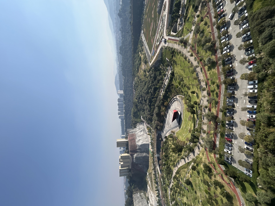n aerial view of a cityscape blending with nature. Skyscrapers rise near a cliff, contrasting with a vast green park. A curved red path encircles a modern, angular building with a red roof. A large parking lot is filled with numerous cars. Mountains and a clear blue sky form the backdrop.