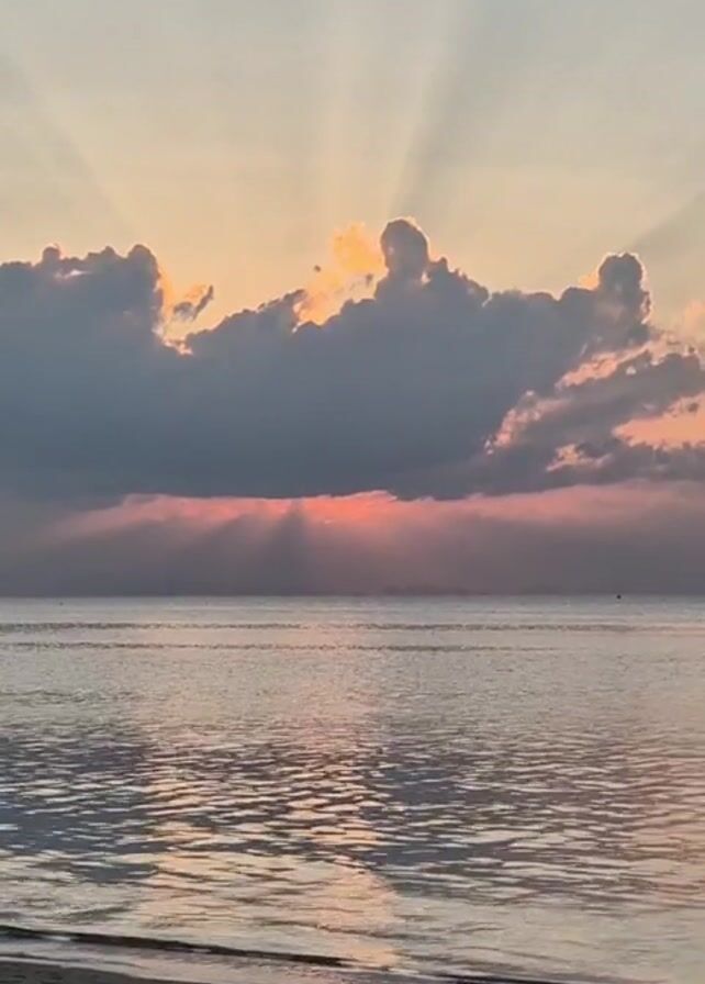 The scene shows a serene beach at sunset. The sky is painted with hues of pink and orange, with the sun peeking through a layer of dark, puffy clouds. Light rays stream upwards and downwards from the clouds, highlighting the sky. The calm water reflects the colors of the sunset, creating a shimmering effect on the surface. The beach in the foreground is sandy, with a gentle slope towards the water. The overall mood is tranquil and picturesque.