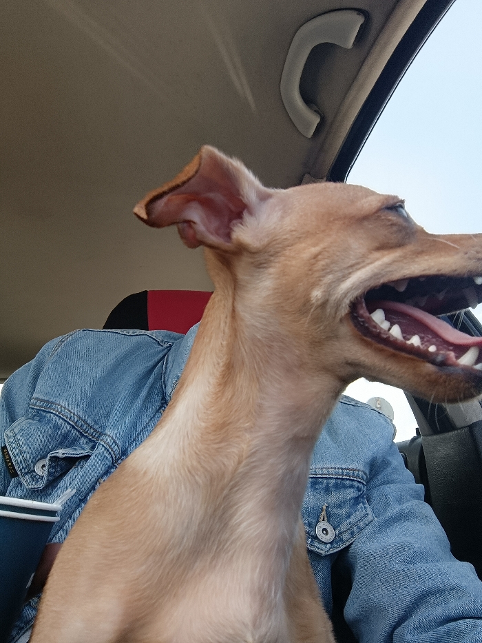 A tan-colored dog is positioned in the front passenger compartment of a vehicle in Belokopitovo, Bulgaria. The dog's mouth is wide open, revealing its tongue and teeth, indicative of panting or an excited vocalization. Its head is turned towards the vehicle's right side, looking out a window at a clear blue sky. Behind the dog, the upper torso and left arm of a person wearing a blue denim jacket are visible. A white and blue disposable cup rests against the person's side. The vehicle's interior features a light-colored headliner and a gray overhead grab handle. A red and black headrest is partially visible behind the dog's neck.