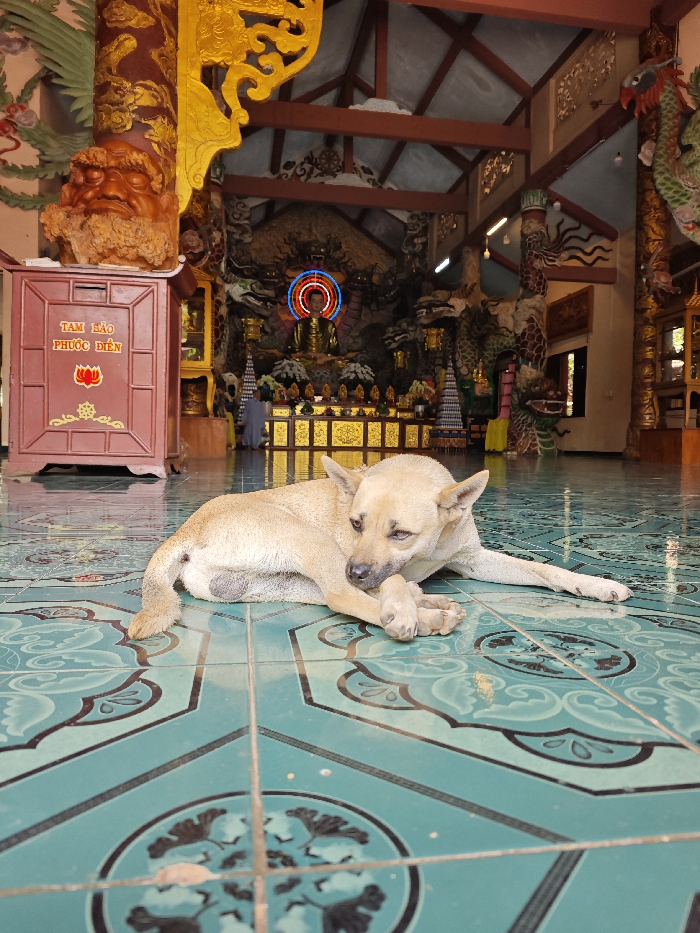 A light-tan male dog lies on its left side with its front paws crossed and head resting, on a teal tiled floor adorned with dark blue geometric and floral patterns. The setting is inside a temple located in Thành phố Đà Lạt, Vietnam. In the mid-ground to the left, a reddish-brown donation box with the Vietnamese text "TAM BẢO PHƯỚC ĐIỀN" and a lotus emblem is positioned beside a large, ornate pillar featuring a carved wooden face. The background reveals a central altar dominated by a gilded seated Buddha statue, illuminated by a concentric blue and red neon halo. Numerous golden offerings and white flowers are arranged on the altar, which is flanked by intricate dark carvings depicting dragons and mythical figures. A person in light-colored robes is partially visible on the far left, near the altar, facing the Buddha. The temple interior displays exposed wooden ceiling beams and additional ornate pillars decorated with dragon motifs.