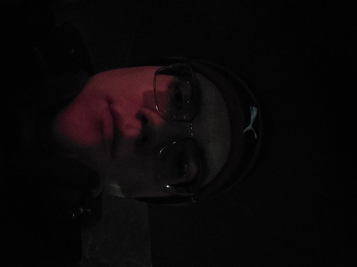 A close-up portrait of a person with glasses and a headband, their face partially illuminated by a red light. The rest of the image is consumed by darkness. The headband features a small logo, possibly a puma, in a light color against the dark material.