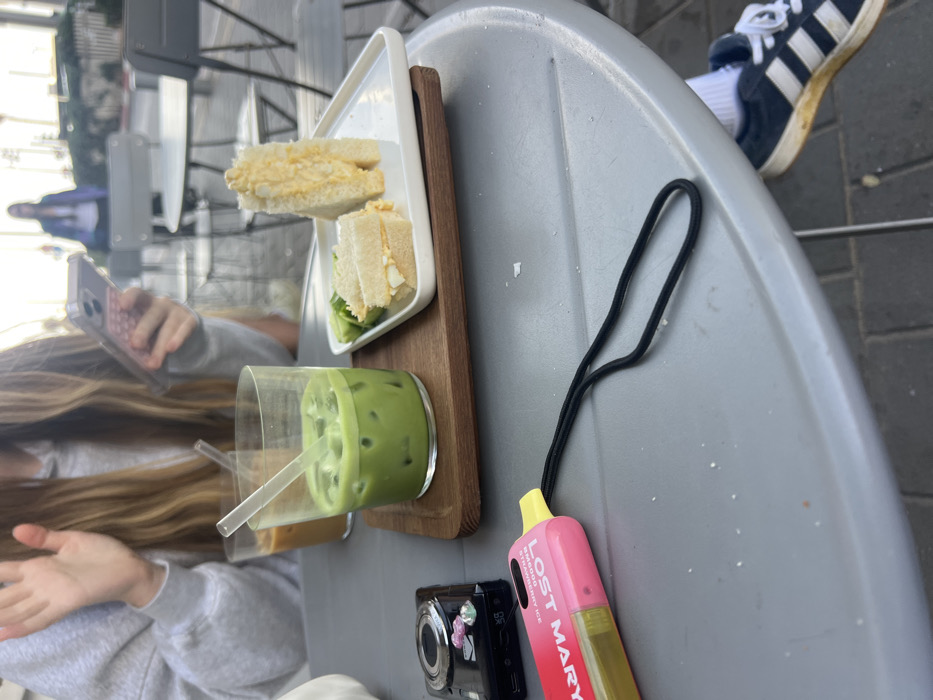 An outdoor cafe scene in Tel-Aviv, Israel, focuses on a table setting. A person with long light brown hair, wearing a grey hooded sweatshirt, occupies the upper left, their right hand raised and left hand interacting with a light-colored smartphone. On the light grey table, a clear glass of iced green matcha with a clear straw sits on a wooden tray. Behind it, another clear glass with an iced light brown beverage and straw is visible. Adjacent on the wooden tray, a white rectangular plate holds three white bread finger sandwiches, two containing egg salad, alongside several slices of green vegetable. To the left, a black point-and-shoot digital camera with a silver lens and a pink floral charm rests on the table. A pink and yellow "LOST MARY BM600 STRAWBERRY ICE" disposable vape pen with an attached black lanyard lies on the table. Small white crumbs are scattered across the table surface. In the lower right, a foot wearing a white sock and a dark blue Adidas sneaker with white stripes and a tan sole is visible. The background is out of focus, showing additional grey metal outdoor tables and chairs, a blurred figure in light attire, and an urban environment with paved ground.