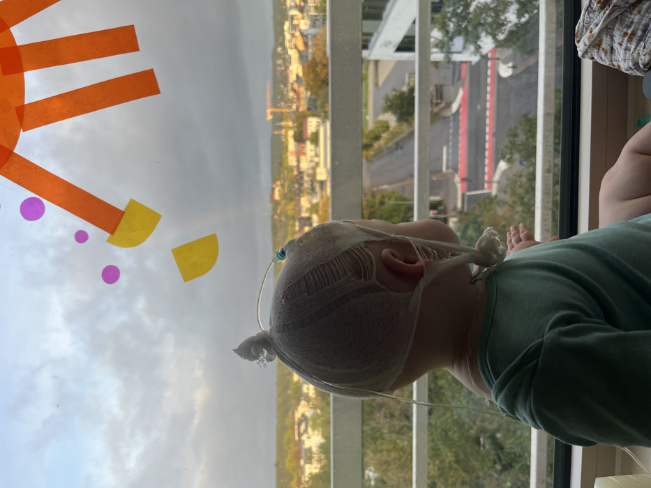 A young child, observed from behind and the right side, is positioned facing a window. The child wears a light blue-green short-sleeved top. A white, open-weave medical mesh cap covers the child's head, secured below the chin, with several tears or stretches in the fabric. Two clear plastic medical tubes are attached to the cap; one descends from the posterior-superior aspect of the head, and another, featuring a turquoise connector, extends upwards from the right side of the head. The child's right hand, fingers slightly splayed, rests on a light-colored window sill. The window pane exhibits translucent paper cutouts, including orange strips forming a radiating pattern, yellow geometric shapes, and purple circular dots. Through the window, an urban landscape under a cloudy sky is visible from a high vantage point. Directly below, a road with multiple lanes features a distinct red-painted section and white markings. Trees with green and early autumn foliage line the road, and a modern white building with dark windows is present to the right. The background reveals the city of Bad Kreuznach, Germany, characterized by densely packed buildings with light facades and red-tiled roofs. In the distance, prominently situated on a hilltop, Kauzenburg Castle (Burg Kauzenburg) is visible. A yellow construction crane is also discernible against the horizon to the right of the castle. The scene is consistent with a hospital room, likely within the Diakonie Krankenhaus in Bad Kreuznach, given its elevated position providing a clear view over the city and identifiable landmarks such as Kauzenburg Castle. The lighting suggests an overcast day with some indirect sunlight illuminating distant structures.