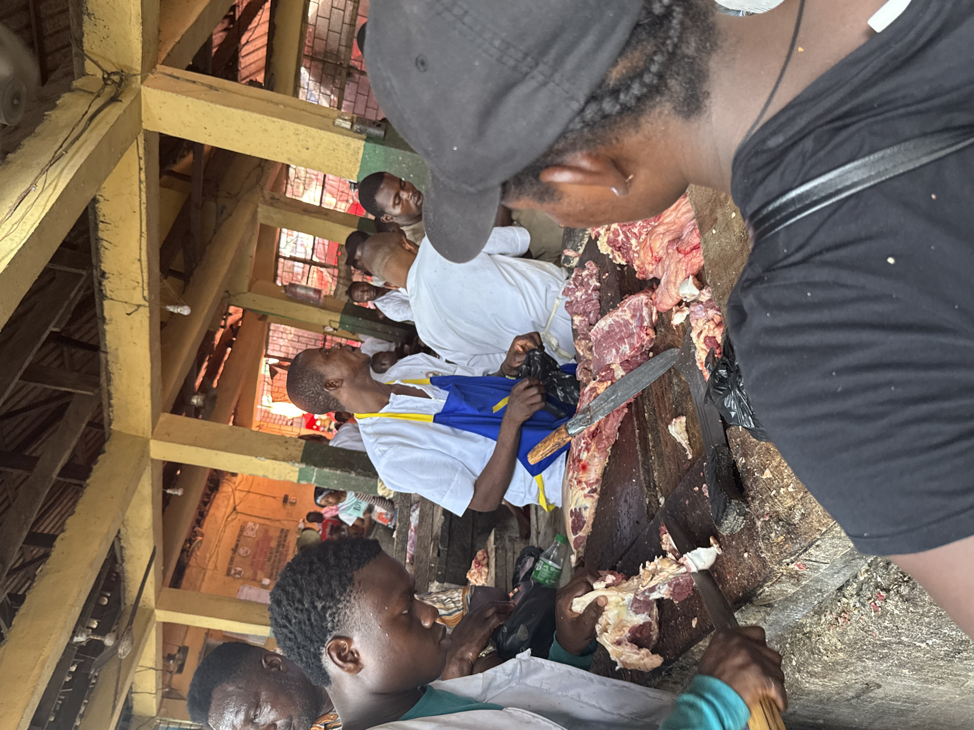 The image depicts a bustling scene in what appears to be a meat market in Lekki, Nigeria