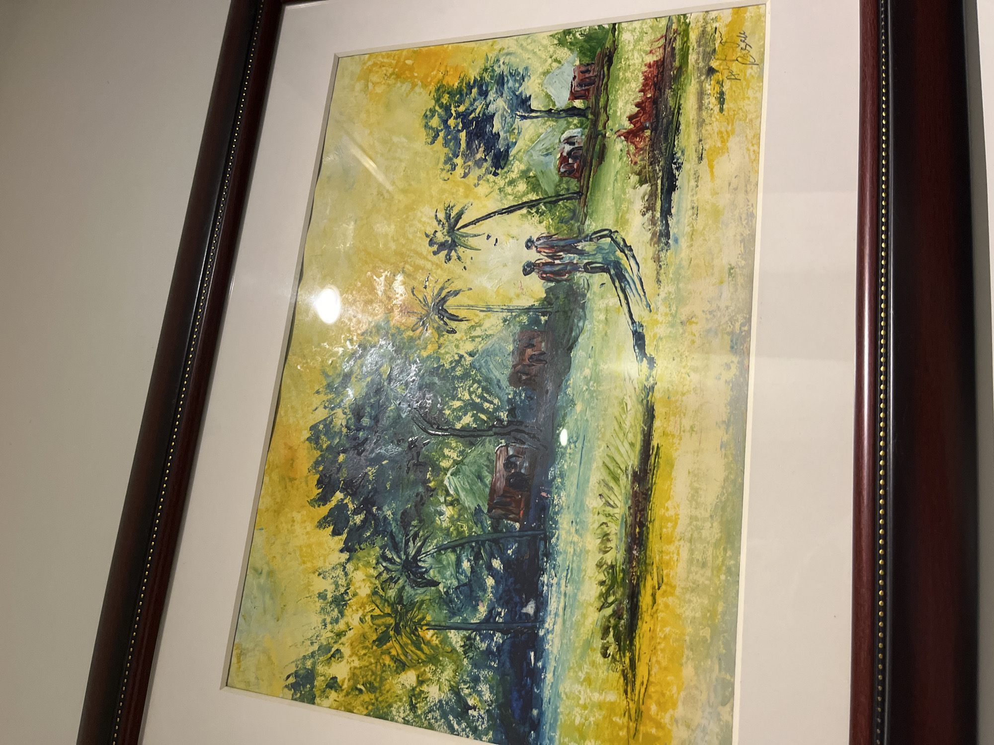 The image displays a photograph of a framed landscape painting. The painting, rendered in an impressionistic style with visible brushstrokes, depicts a vibrant rural scene under a warm yellow sky that dominates the upper portion. The landscape features a mix of green and yellow ground cover. Several tall palm trees and dense, dark green and blue-green trees are scattered across the mid-ground. Multiple small, round-roofed huts or houses, colored reddish-brown with lighter accents, are visible among the foliage. Two human figures, seen from behind, walk from left to right along a discernible path in the lower-middle section, casting long, dark shadows. The bottom right corner of the painting contains an illegible signature. The artwork is enclosed by a wide, white mat and a dark brown wooden frame, which features a row of small, gold-toned decorative studs along its inner edge. A distinct circular light reflection is present on the protective glass covering the painting, situated in the upper-left quadrant. The framed painting is mounted on a plain, light-colored wall. No specific visual information within the image allows for the precise identification of its location within the city of Abuja, Nigeria.
